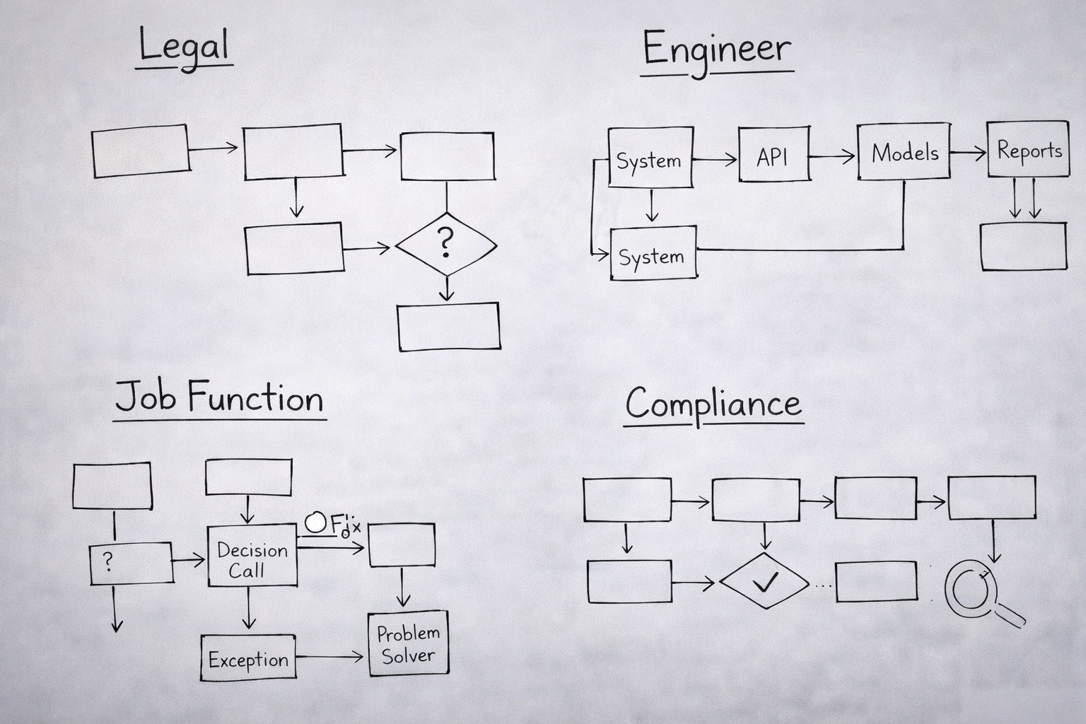 Does your legal team know it? Does your AI or ML engineer — the person who will be building the system that sits inside that workflow — know it? Does your compliance lead know which step involves a judgment call that currently sits inside one person's head and nowhere else? Does your data team know which inputs the workflow depends on that have never been formally documented?